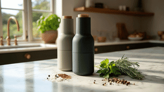 Norm Architectsによる遊び心のあるボトル型デザインが特徴的なスパイスミル。上部配置のセラミックグラインダーが余分な散乱を防ぎ、塩胡椒だけでなく様々なスパイスに対応。北欧ミニマリズムと機能美の融合を体現した、MENUを代表するプロダクトです。