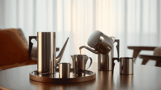 1967年、アルネ・ヤコブセンがステルトン社のためにデザインしたステンレス製テーブルウェア。円筒形を基本形状とし、装飾を一切排除した純粋な造形美は、スカンジナビアン・モダンの精髄として今なお世界中で愛され続けている。