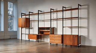 1959年、ジョージ・ネルソンがハーマンミラー社のために設計した革新的モジュラー収納システム。標準化されたコンポーネントの自在な組み合わせにより、住宅からオフィスまで多様な空間ニーズに応える。後のシステム家具の原型となった名作。