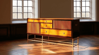 エドワード・ウォームリーが1957年にダンバー社のために設計したミッドセンチュリー・モダンの傑作。上質なマホガニー材とタンブールドア、ブロンズベースが生み出す端正なプロポーションは、今日なお高い評価を受けている。